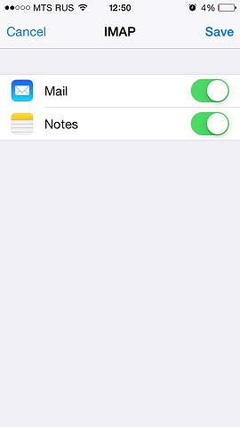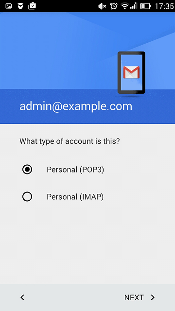 Tap Next. At the top of the next screen, select IMAP (if you want to keep copies of received email messages on the server) or POP. Then, specify the details of your incoming and outgoing mail servers. For both servers, you should enter the following: Once the email configuration is added, tap Save to continue. The connection to the specified server will be verified. If the connection is OK, you will see the screen where you can choose what information you want to sync with your phone.