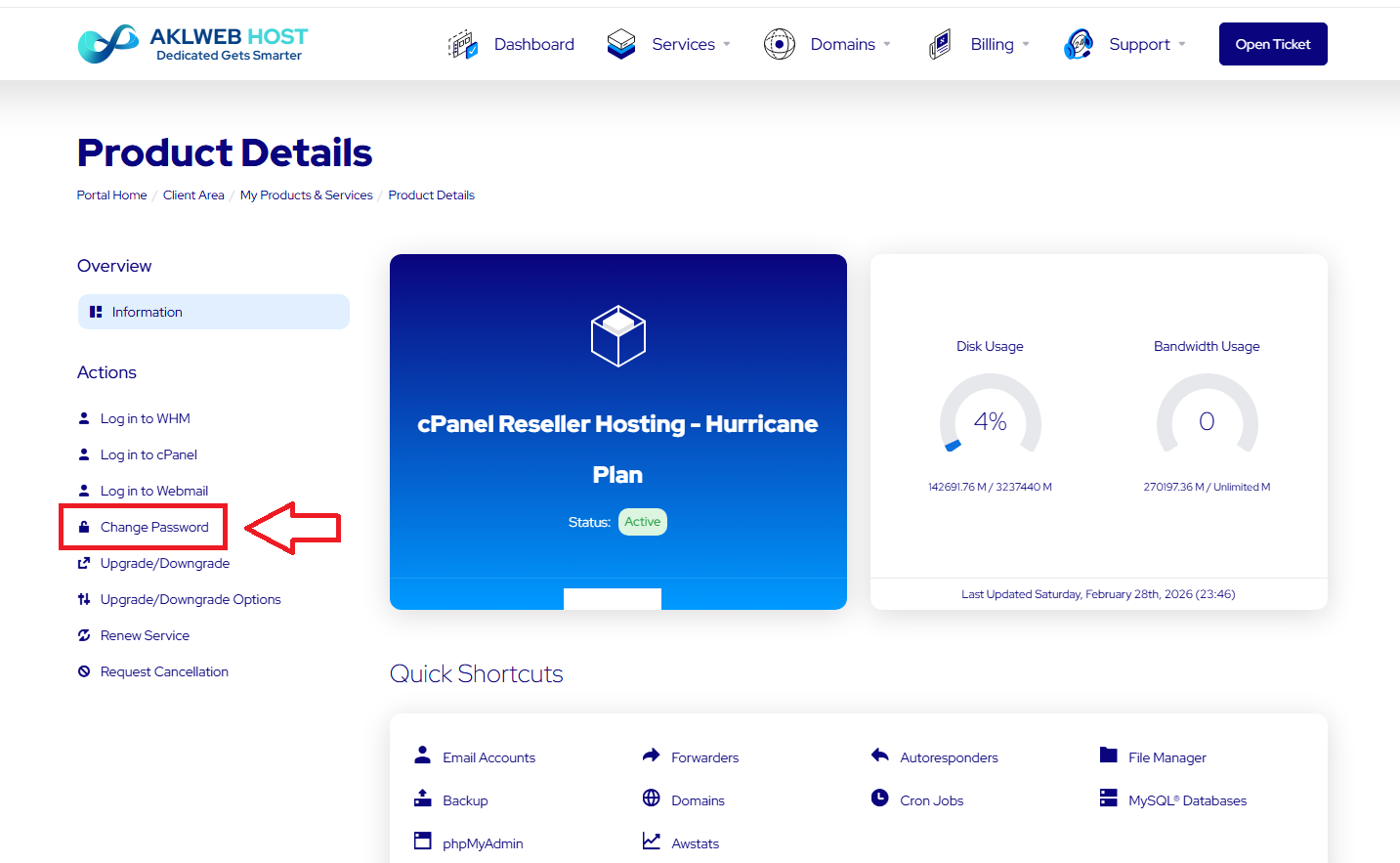 Log in to your Client Area >click on the Services Tab > click on the required services you have. When you are under the Product Details tab on the left side of the bar, you’ll see Change Password; click on that tab.